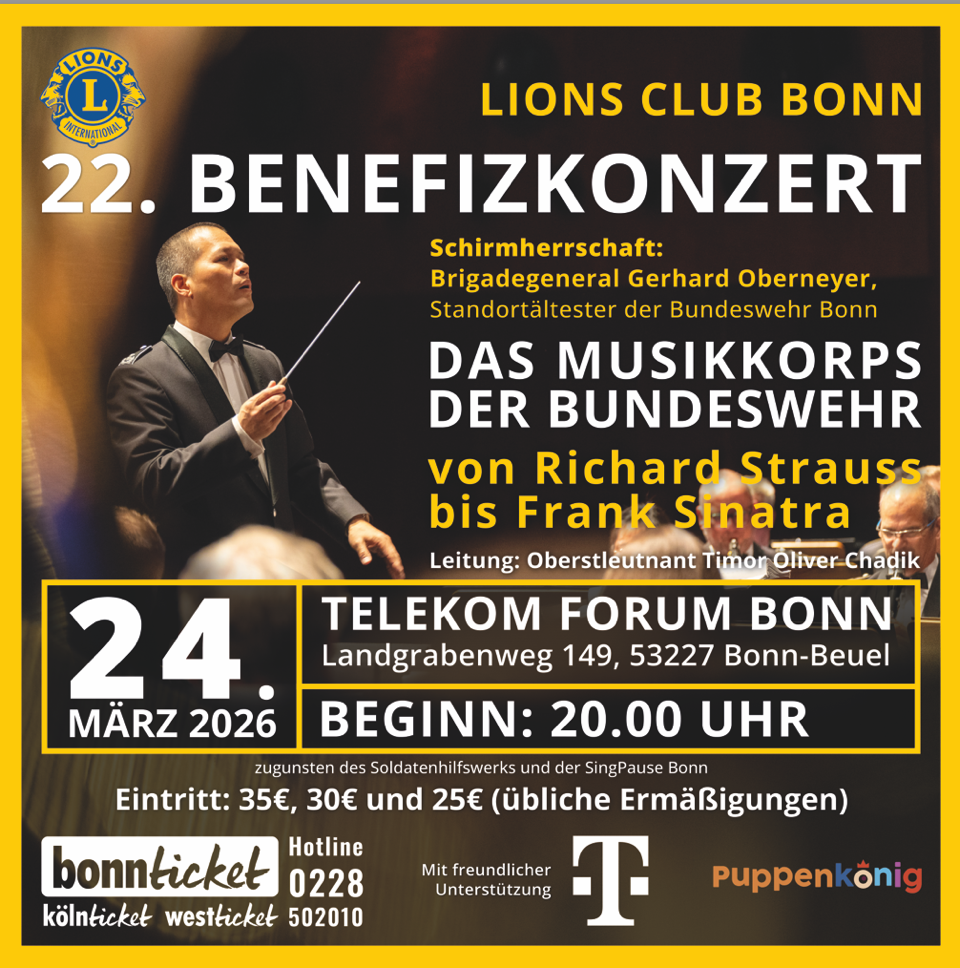 Der Lions Club Bonn veranstaltet das Benefizkonzert zum 21. Mal. Es wird am 8. April 2025, 20:00 Uhr, im Telekom Forum Bonn stattfinden. Das Musikkorps der Bundeswehr (Siegburg) spielt unter der Leitung von Oberstleutnant Christian Weiper unter dem Motto ‚Pictures & Movies - von Mussorgsky bis Morricone‘. Die „Bilder einer Ausstellung“ werden extra für dieses Konzert neu gesetzt.