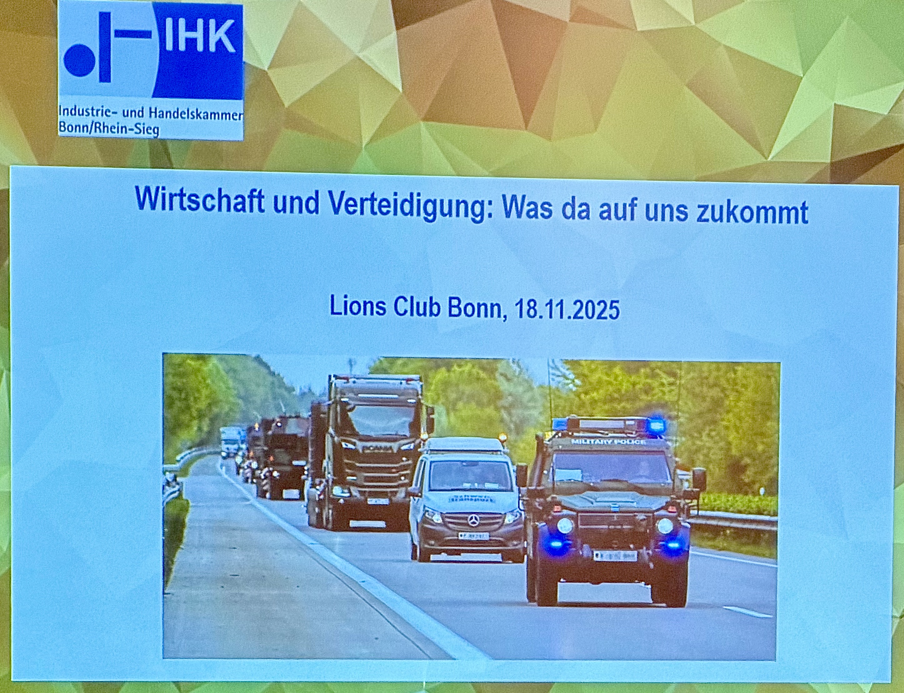 Am 19. November 2025 war der Hauptgeschäftsführer der IHK Bonn / Rhein-Sieg, Dr Hubertus Hille, als Vortragsredner im Lions Club Bonn zu Gast. Er berichtete über die gegenwärtige Einschätzung und Erwartungen der regionalen Wirtschaft nach der Kommunalwahl im Herbst dieses Jahres zu den wichtigen Themen Verkehrspolitik und Wirtschaftsförderung.
